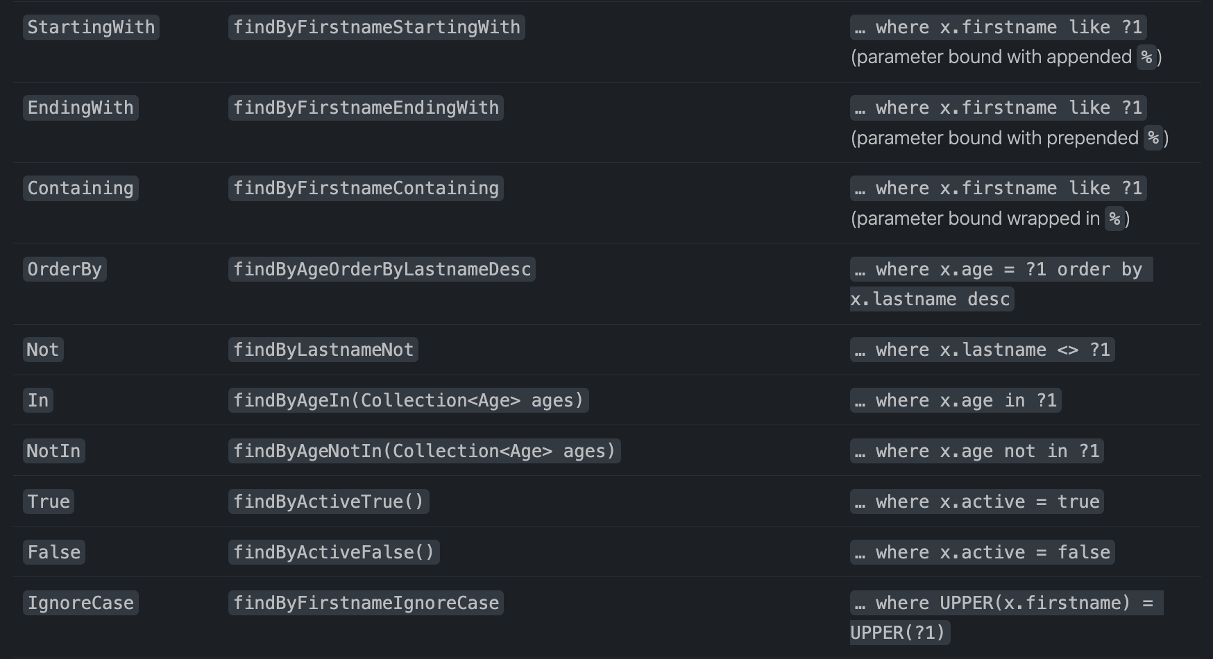- findByNameLikeOrderByNameDesc()